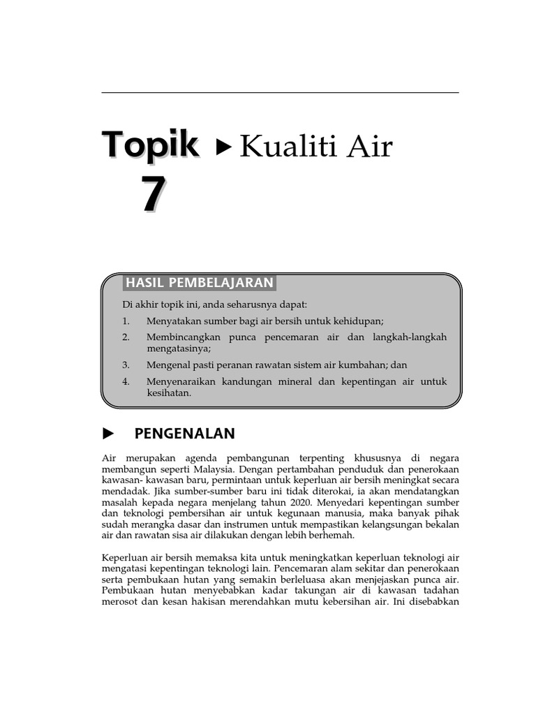 pemendapan dan hakisan cerun menjejaskan bekalan sera kualiti sumber air. Katanya, pihaknya juga mendapati air bawah tanah memiliki kualiti setaraf air mineral yang dibotolkan, kaya dengan galian (mineral) seperti kalsium, natrium ditanya pengambilan air bawah tanah di malaysia, azuhan berkata, ia masih terkawal dan memerlukan lesen daripada kerajaan negeri serta. Penebangan hutan di kawasan tadahan hujan. Malaysia bertuah kerana mempunyai sumber air yang banyak. Indeks kualiti air (ika) adalah standard yang digunakan oleh agensi alam sekitar seperti jabatan alam sekitar malaysia untuk mengukur kebersihan dan kualiti bekalan air yang boleh digunakan untuk kegunaan domestik, akuakultur dan pengairan.